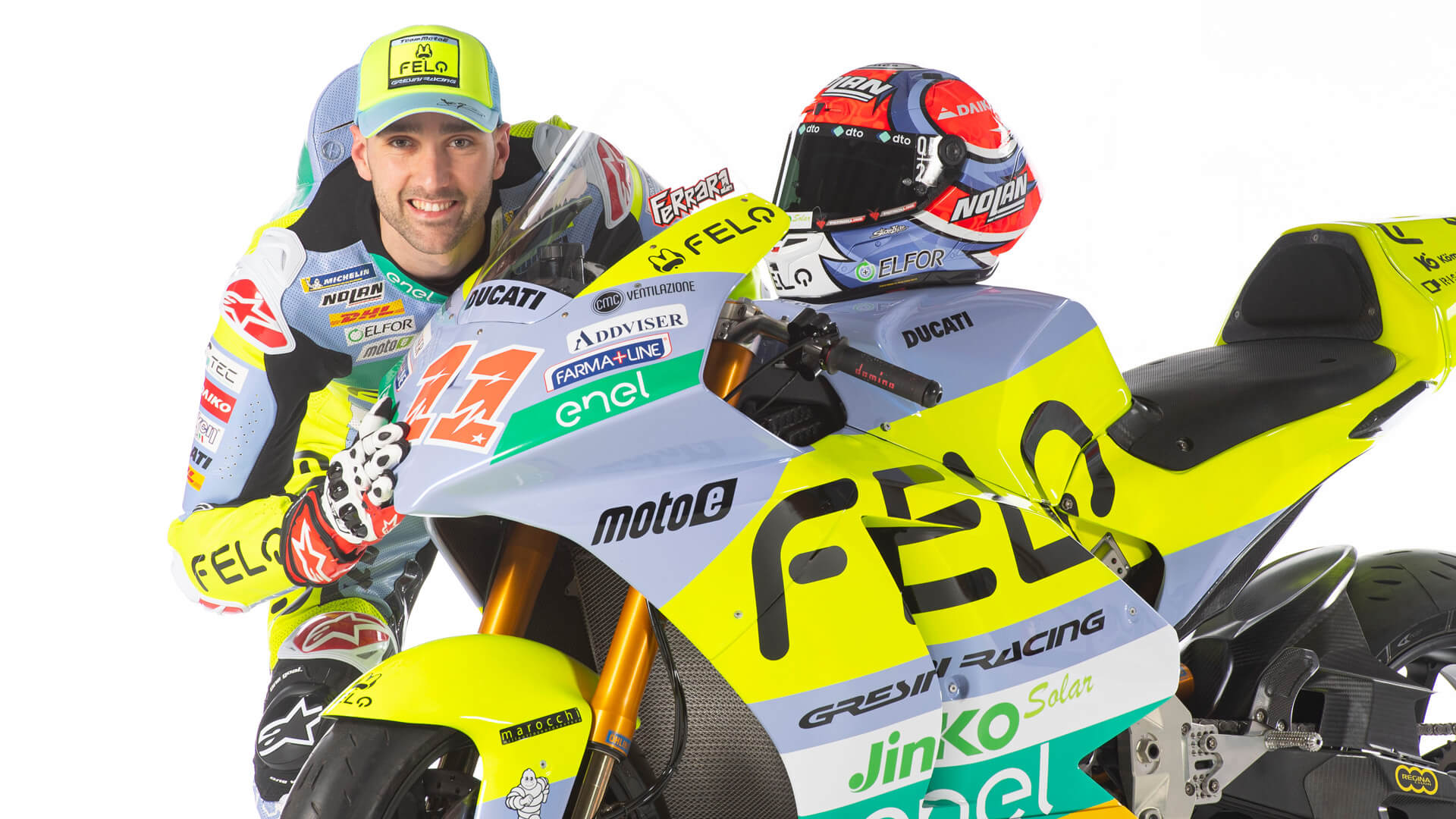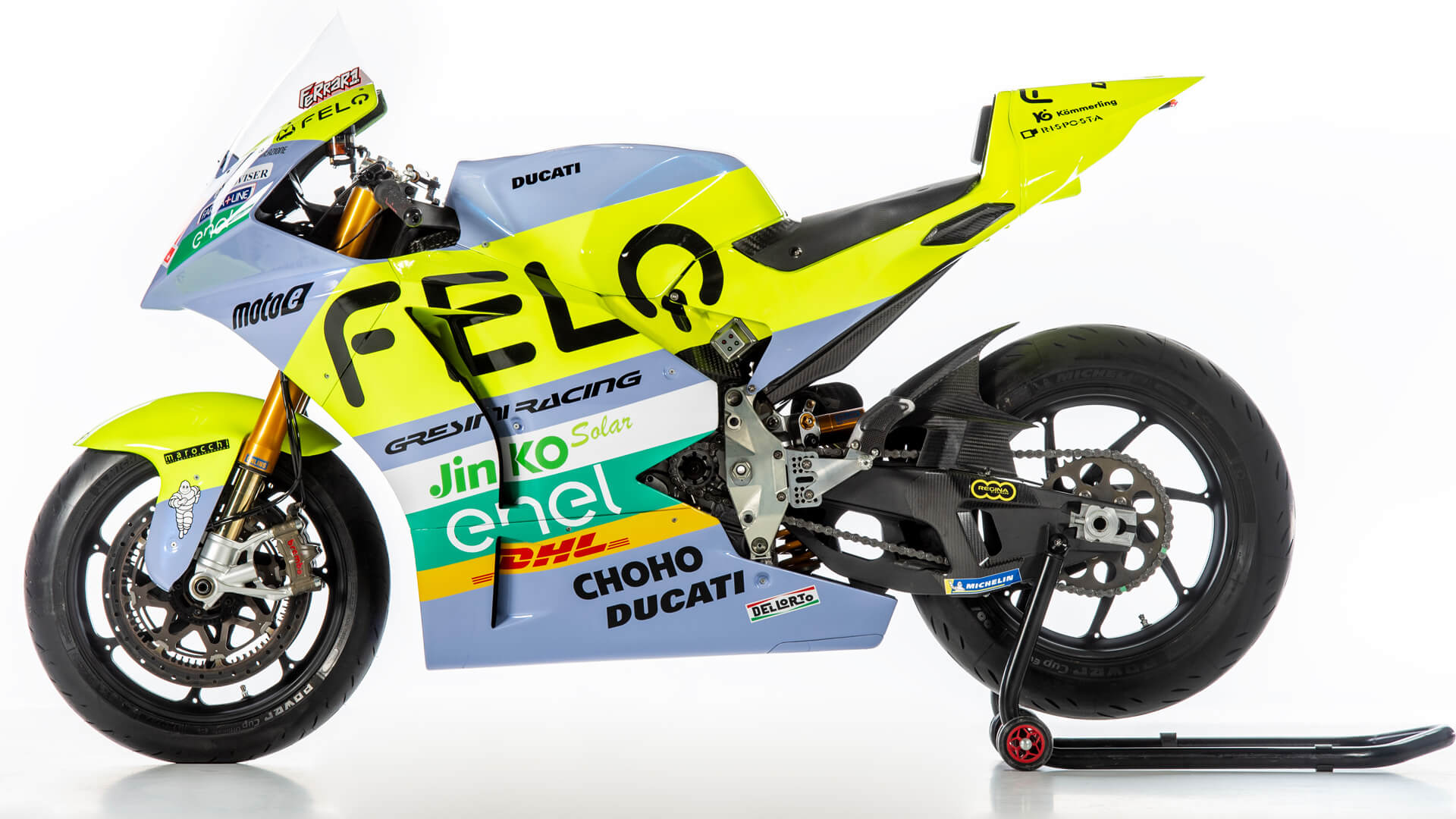 La nuova livrea si caratterizza per una finitura xirallica che va a ricoprire il classico celeste Gresini, bilanciato dal giallo sgargiante delle due Ducati elettriche #11 e #72.